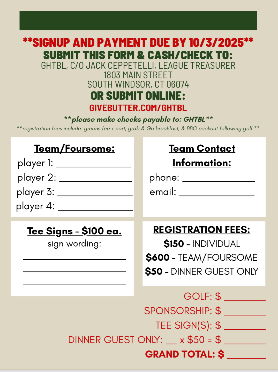 Contact Jack Hurley at jkhurley@cox.net for $60 tickets. Cash or checks made to “GHTBL” can be sent to 53 Candlewyck Drive, Newington, CT 06111. Or patrons can pay at the door on November 15th.