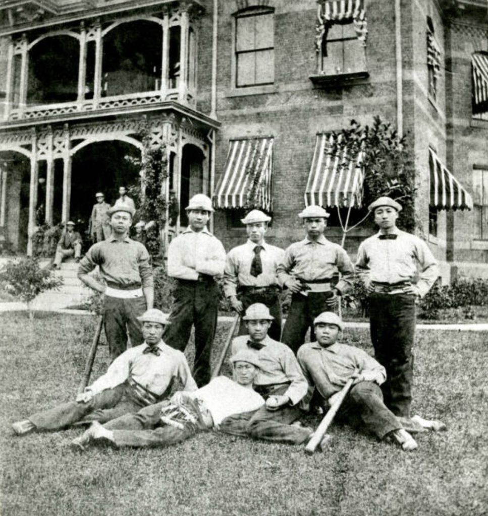 The Chinese pupils learned baseball during an era when the game was spreading rapidly in popularity throughout the United States. Their team of at least nine players was called the Celestials (also referred to as the Orientals). Members of the team, like most Chinese students in 1874, lived at the Chinese Education Mission headquarters at 352 Collins Street, Hartford. It was a large Queen Anne style mansion with dormitories and classrooms. When warm weather allowed, many of the students could be found playing baseball on the front lawn.