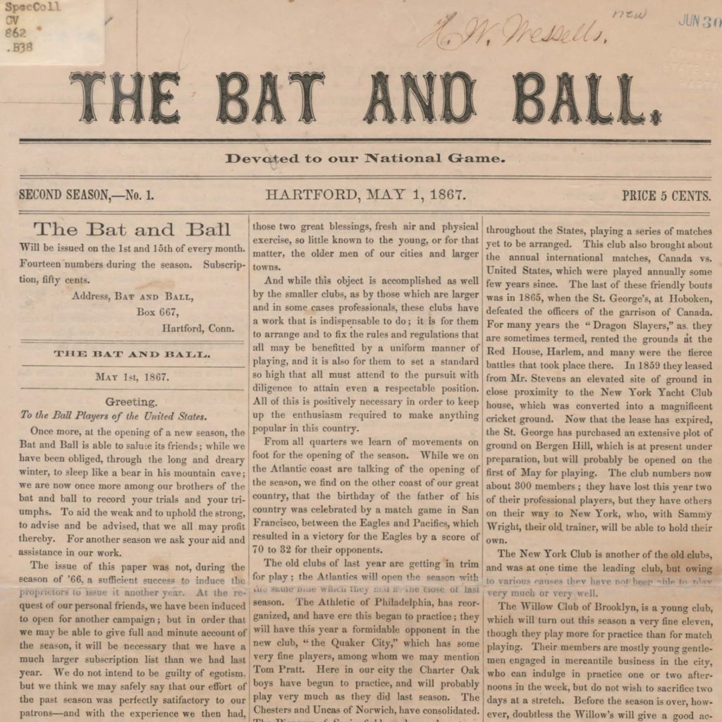 Before the discovery of The Bat and Ball, historians acknowledged The Sporting News as the first periodical to feature baseball – debuting March 17, 1886. However Hartford’s The Bat and Ball preceded The Sporting News by twenty years. Authorship of The Bat and Ball is unknown because the periodical was written anonymously, though a possible author may have been Gershom B. Hubbell, President of the Hartford Base Ball Club and a telegraph operator for Western Union.